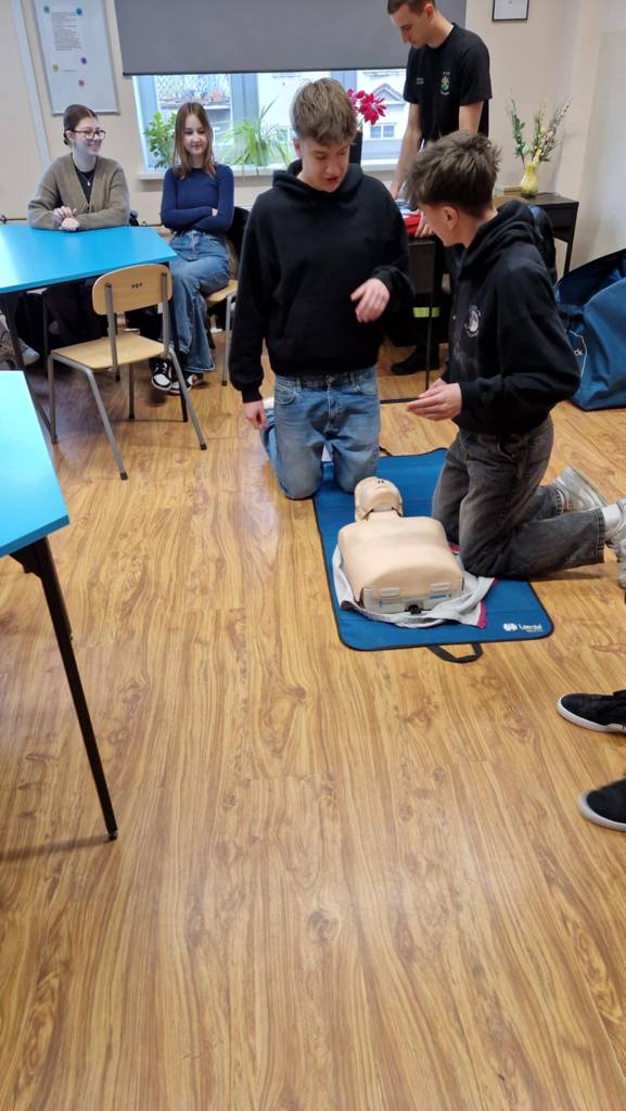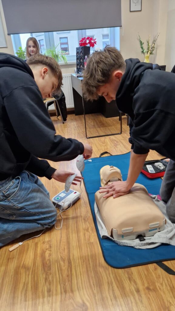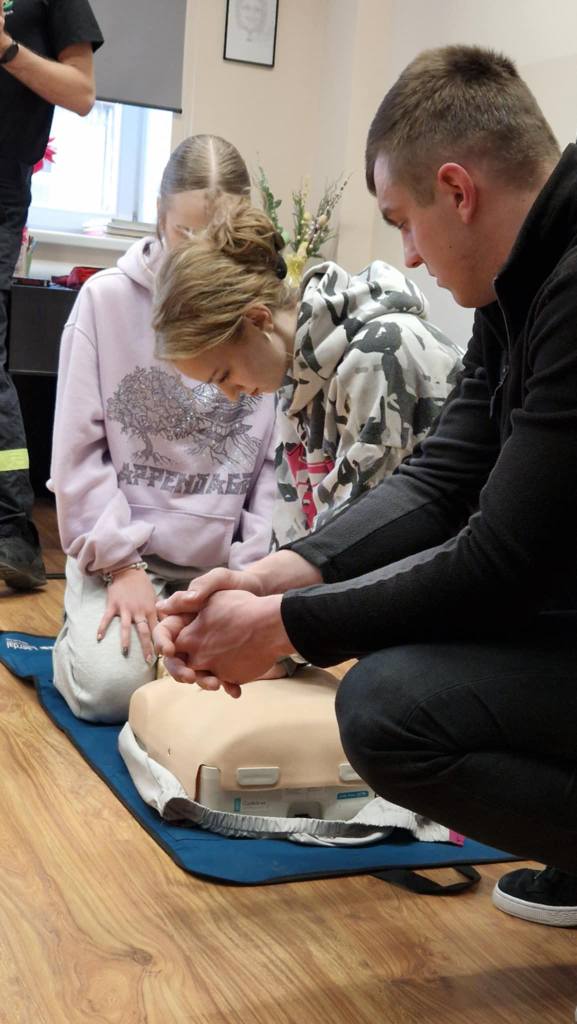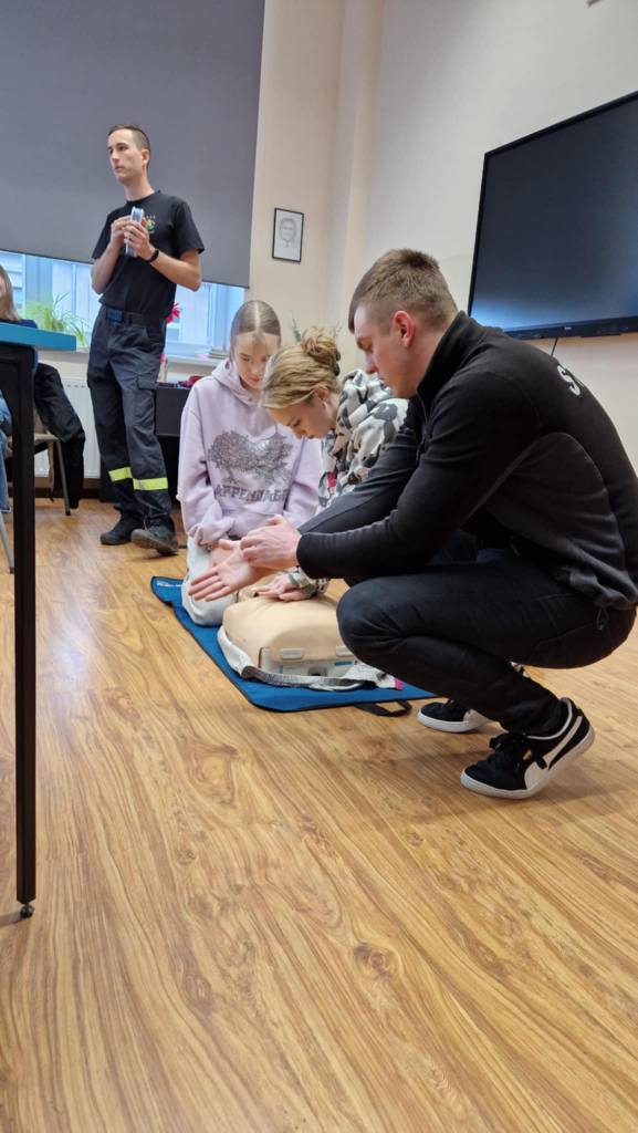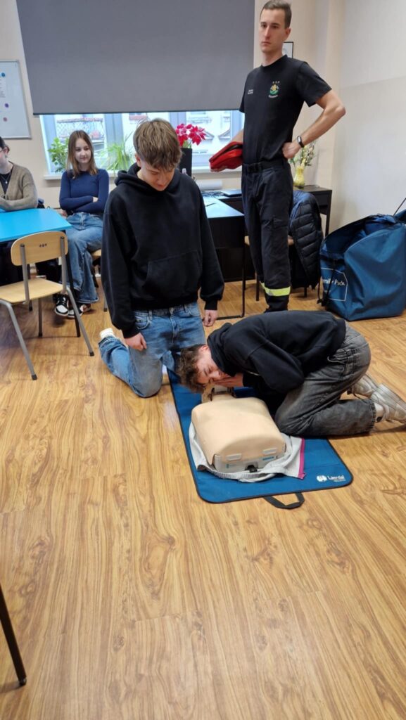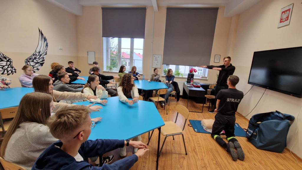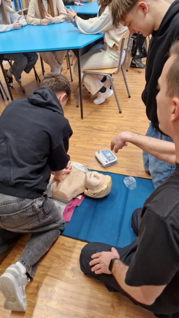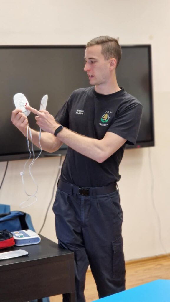 Odwiedzili nas strażacy z Ochotniczej Straży Pożarnej Wschowa, którzy na co dzień pełnią również służbę jako strażacy zawodowi. Przeprowadzili dla naszych uczniów niezwykle ważne szkolenie z zakresu resuscytacji krążeniowo-oddechowej oraz obsługi defibrylatora AED, który niedawno pojawił się w naszej szkole. W szkoleniu wzięli również udział niektórzy pracownicy szkoły.