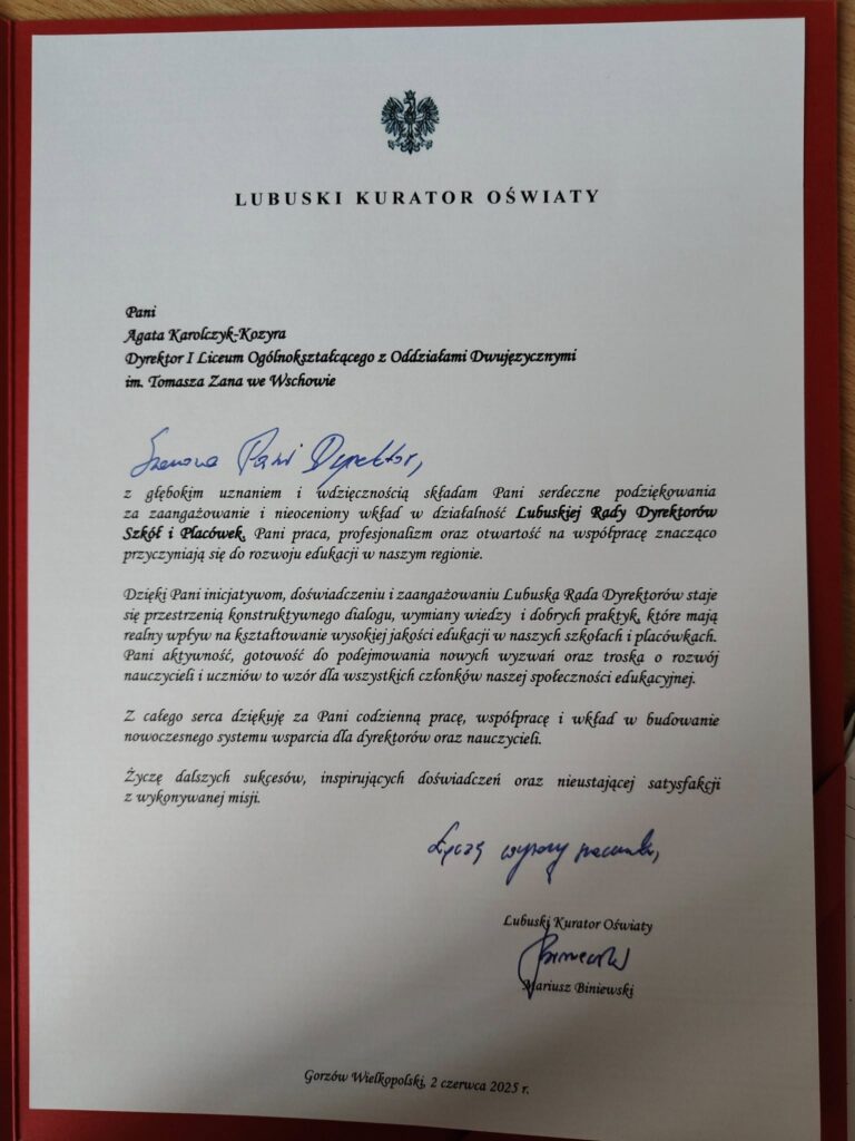 2 czerwca, Pani Dyrektor Agata Karolczyk-Kozyra uczestniczyła w Gorzowie Wielkopolskim w spotkaniu podsumowującym działalność Lubuskiej Rady Dyrektorów Szkół i Placówek przy Lubuskim Kuratorze Oświaty. Podczas wydarzenia Lubuski Kurator Oświaty Pan Mariusz Biniewski podziękował członkom Rady za wszystkie działania na rzecz edukacji w naszym województwie w kończącym się roku szkolnym. Rada omówiła rekomendacje na kolejny rok oraz podsumowała inicjatywy podejmowane w roku szkolnym 2024/25. Spotkanie swoją obecnością zaszczycił Wojewoda Lubuski Pan Marek Cebula, który wraz z Panem Kuratorem Mariuszem Biniewskim uroczyście wręczył podziękowania za zaangażowanie i gotowość do współpracy na rzecz poprawy standardów edukacji w województwie lubuskim.