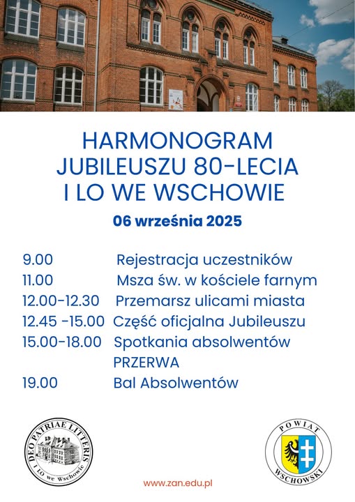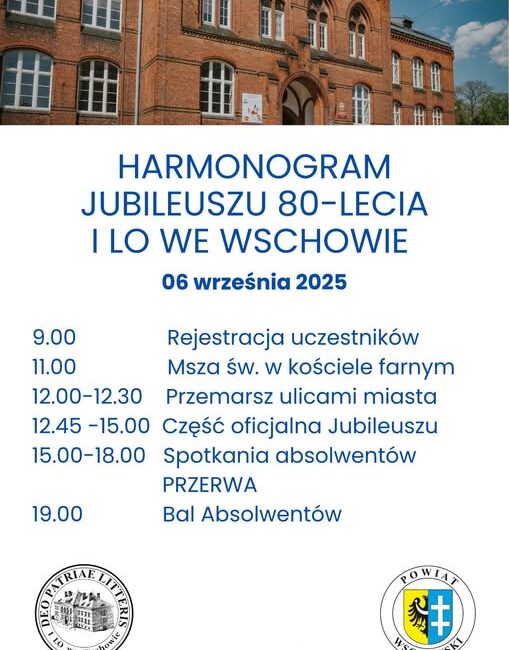 Zjazd Absolwentów In Bez kategoriiPosted 18 czerwca, 2025 Główne obchody Jubileuszu 80-lecia szkoły coraz bliżej. Poniżej prezentujemy harmonogram uroczystości.